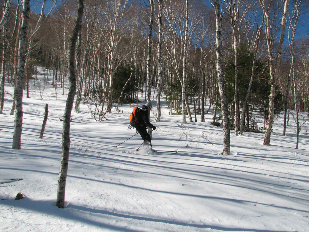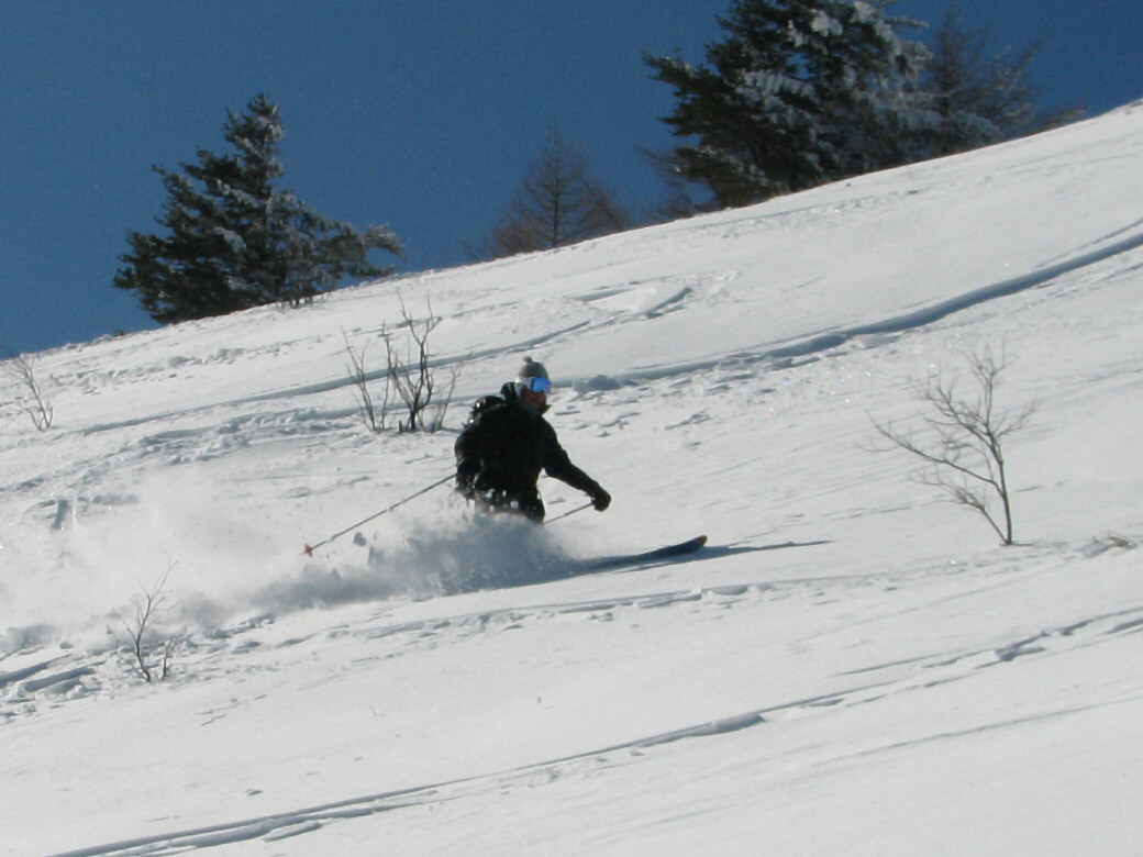 なぜか、日曜なのにあんまり人が居ません。昨年は、土日に来ると結構人が居たんだけど・・・ まぁ僕のところもお客さん一人だけなので、さみしーです(笑 もはや、湯の丸山は廃れてしまったのか? それとは別にスノーシューで登ってる人たちはいつもより多かったかも? これからはスノーシューが旬な山になるのかな? 今日もマズは登ります。 下から山頂を見上げると、雪煙があがってて、こりゃー風が強いぞーって思ってたら、 つむじ風が雪を巻き上げながら次々に僕らの前を通り過ぎてきました。 いやー最初は飛ばされるんじゃないかとヒヤヒヤしたんだけど、それ程でもなかったかな? で!山頂です。 今日のお客さんは4・5年前からのお客さんです。 基礎体力はバッチリなので、それ程休憩も取らずにピークに立っちゃいました。 今日も北アルプスがバッチリ見えます! 今日のコディションは、おおむねパウダー(但ししまり気味) 時々クラスト なので、やっぱり気が抜けません。 思い切ってターンすればいいんだけど。 どうかなーどうかなーって考えてるとやられます(笑 今回滑走距離を伸ばそうと思って、いつもは行かない方向に行ってみたら! 渾身のルートミス(汗っ! 藪漕ぎがキョーレツでした・・・ 何とか藪を抜けて旧鹿沢スキー場跡地に出るところ この辺もビミョーなパウダーでしたねぇ で!これまたいつものスキー場跡地のレストポイント おつかれさまでしたぁ PR