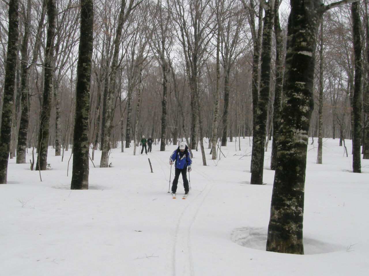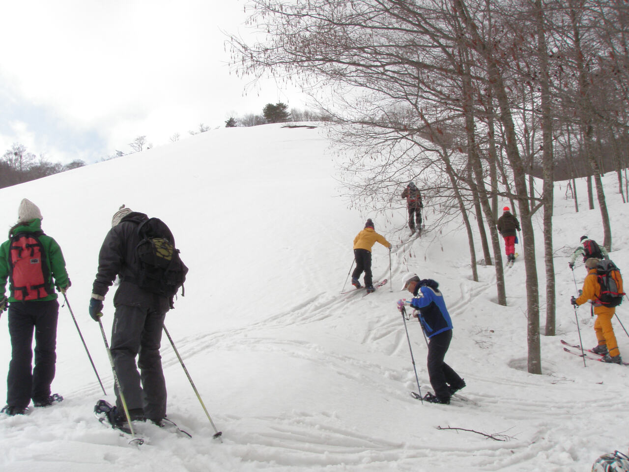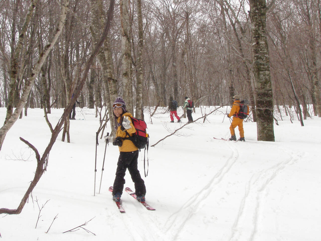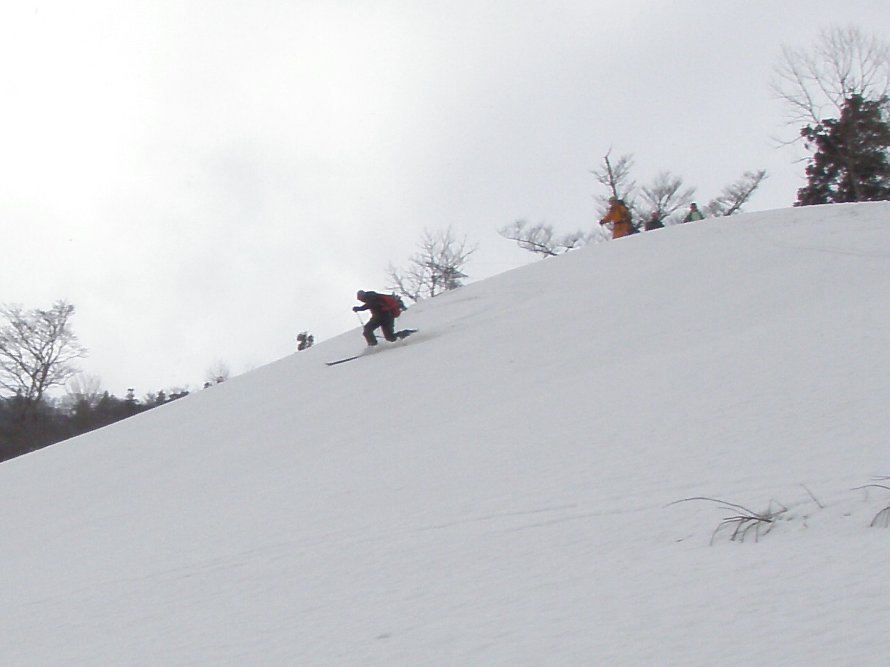 ビギナーの方のご参加や、思いがけず参加者が増えて・・・無理はせずにいつもの尼ヶ禿山ツアーの ハイライトの斜面だけ行く事に・・・ 今日の天気は、予報と違い雨は降りませんでした! 雪は降ったけど(笑 今日はキャンプ場からアプローチします。 森の中をゆっくり滑ります。 で!今日のメインゲレンデに! スキーに自信がない人はスノーシューで登ります。 みんな思い思いのルートで登ります。 スノーシューはチョクトウですが! ピークに到着です。今日は雨は降らなかったけど、不安定な天候なので雲が出やすくて、ゲレンデの後ろは見えません(悲) それぞれのスタイルで滑ります。 まぁテレマークじゃなくてもね(笑 思い思いのトレースを描いて滑りました。 ゲレンデとはちょっと違う、自然のままの斜面は少しでも滑り応えがありますよねぇ! PR