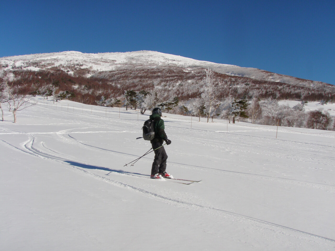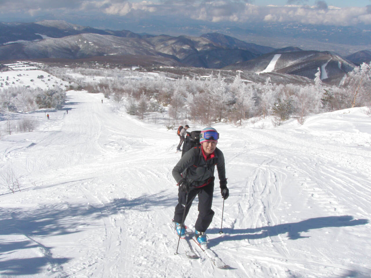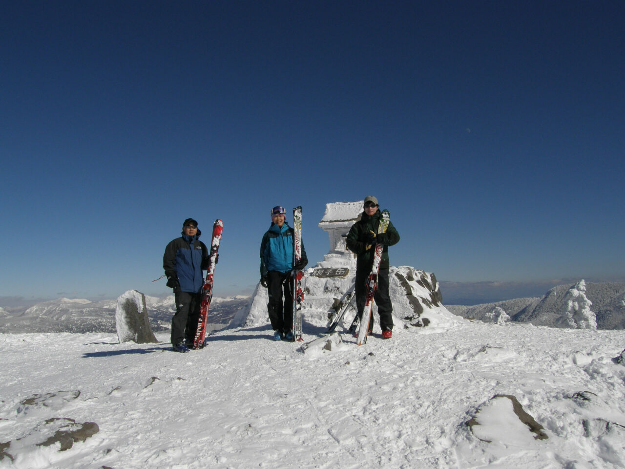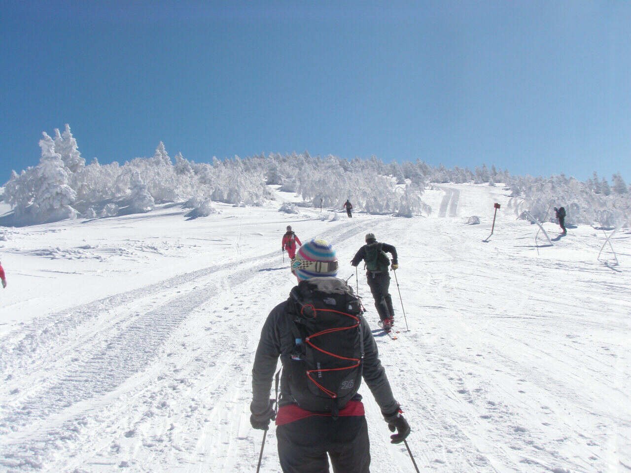 青空と霧氷 モンスターに成長するには木が細すぎるかな? 今回も?汗だくで登って滑る、楽しいツアーでした(笑 スキー場を後に登り始めて、30分ぐらい ゲレンデがはるか下に見えてます。 これから、ゆっくり登って、1時間半位で山頂です。 それにしても暑い! 平日とは違って、人がいます(笑 牧場から、登って降りてくる登山者もいます。 山頂は未だ見えないけど、のんびり登っていきます。 もうすぐ山頂! この樹林帯を抜けると、すぐに山頂が見えます。 で!山頂です。 抜けるような・・・というか抜けちゃってる青空 でも・・・風が強くて、写真を撮ったら、さっきの樹林帯に戻ってお昼ご飯です。 ご飯を食べたら、お楽しみタイム! 三者三様のスキー 根子岳の斜面は全体的にj緩やかな斜面が続くのでお好みの斜面を選んで滑ります。 尾根筋と沢筋を交えながら滑ると、斜面変化が楽しめます。 山頂直下は風にたたかれて、クラストしてるところも結構あって、ちょっとてこずったけど(笑 ゲレンデでは味わえない広大な斜面! 楽しく滑って、ゲレンデに滑り込みます。 下から山頂を見上げると、滑ったなぁ! って実感湧きますね(笑 PR