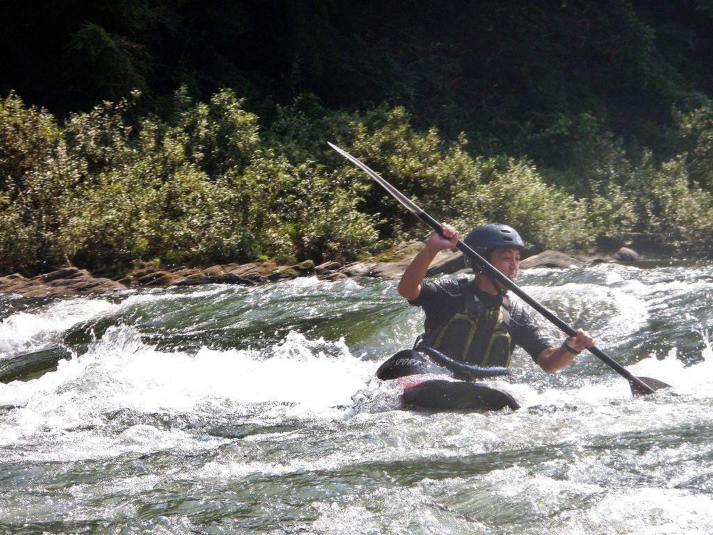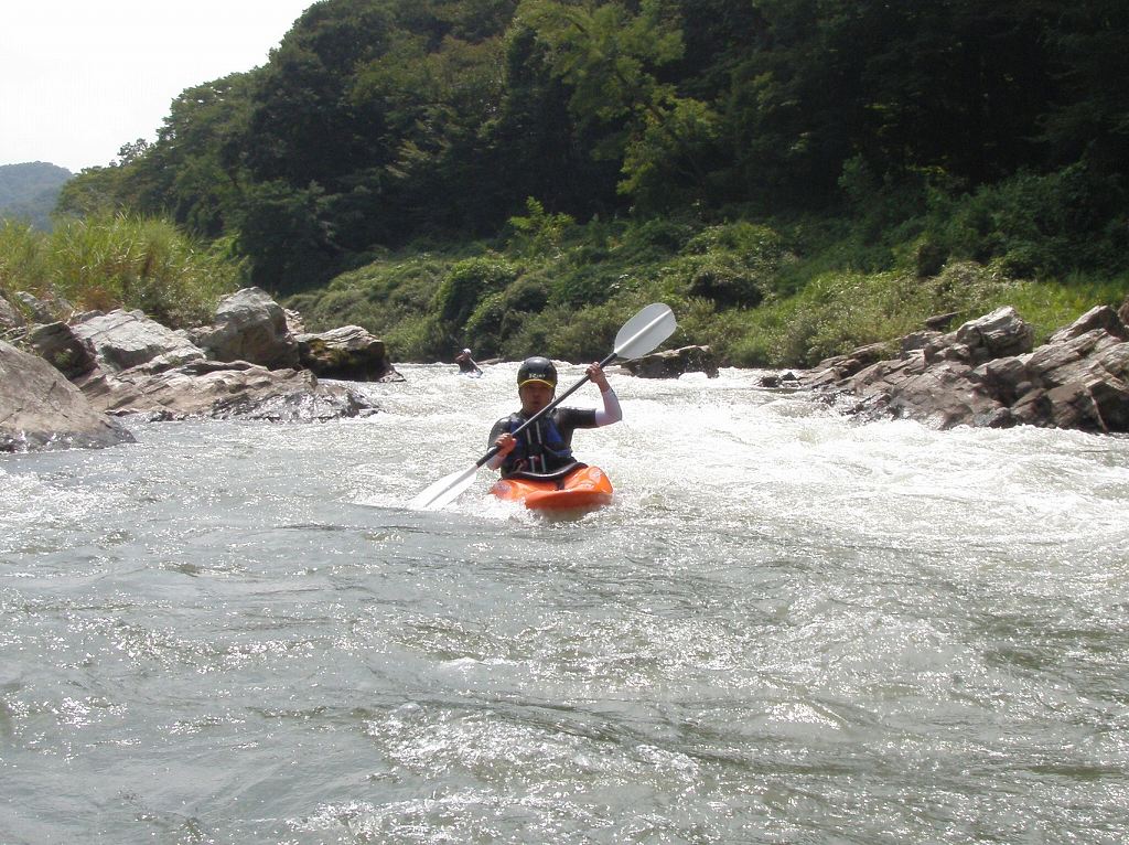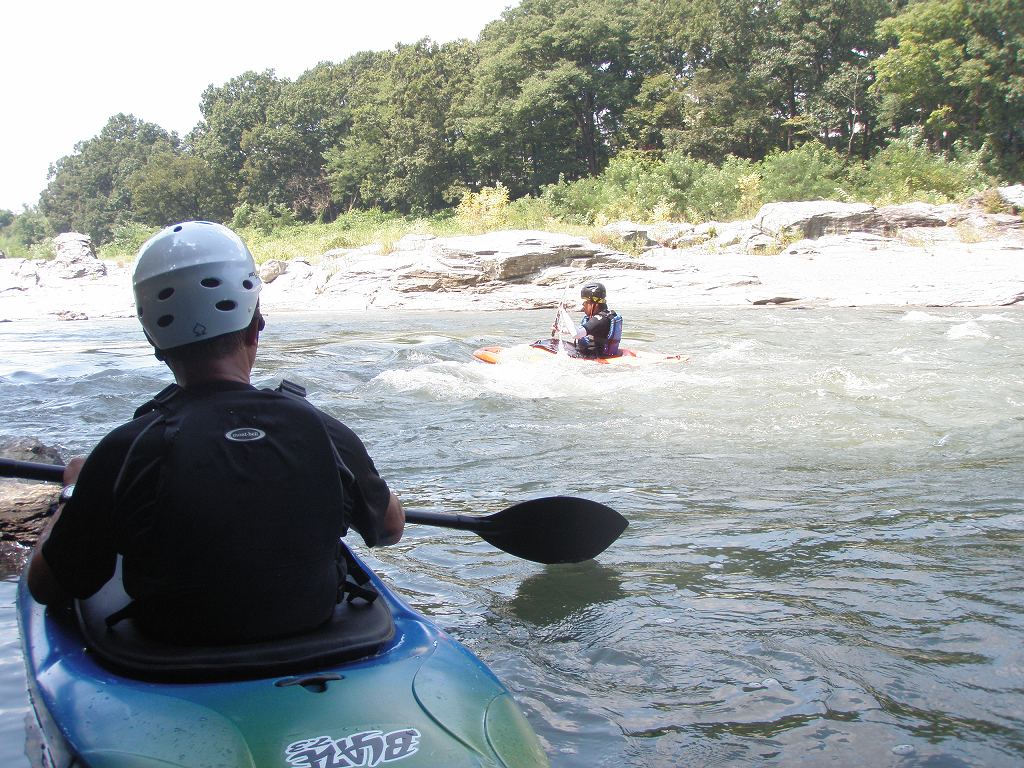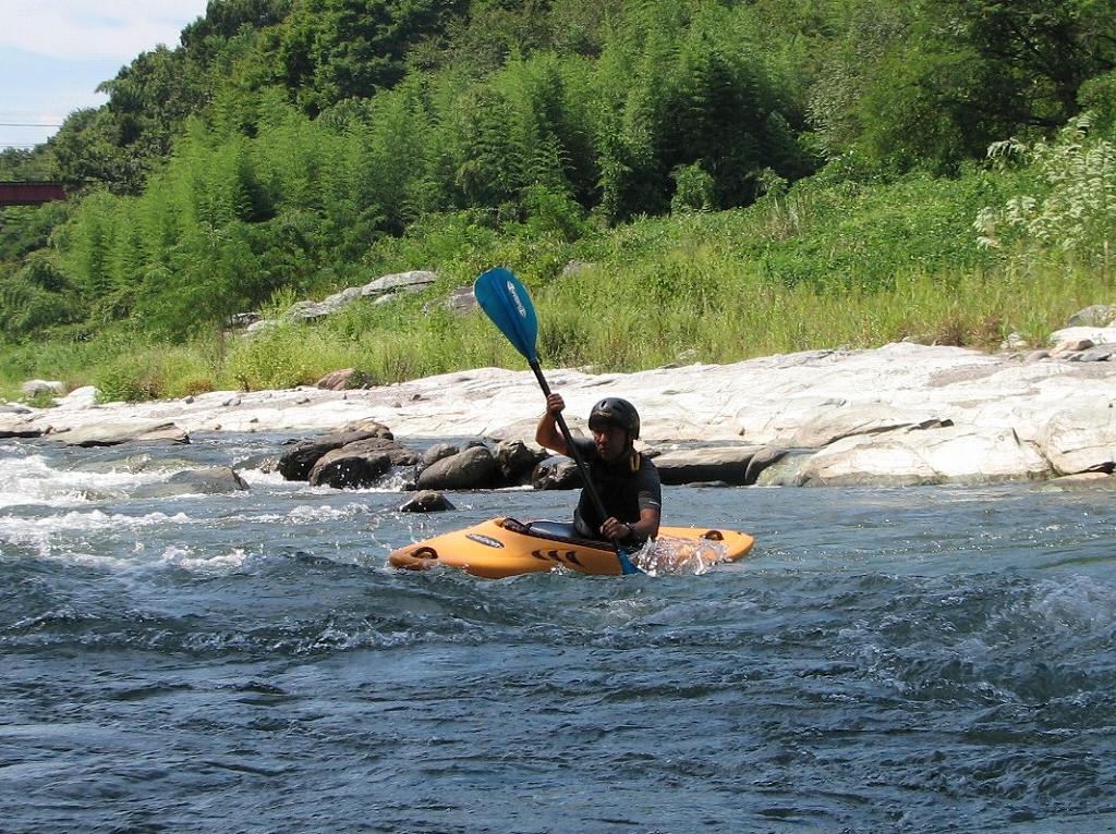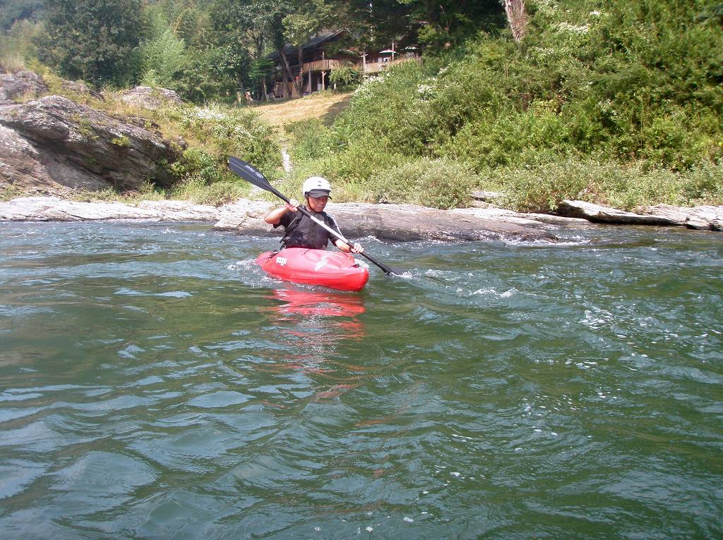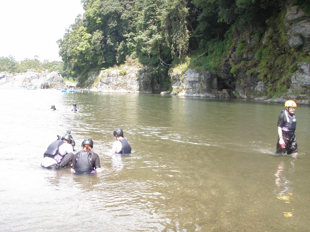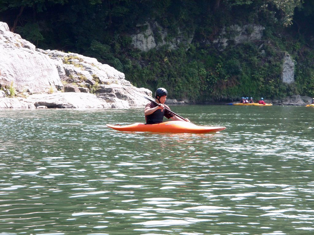 × [PR]上記の広告は3ヶ月以上新規記事投稿のないブログに表示されています。新しい記事を書く事で広告が消えます。 9月にはいってもまだまだあっつい日が続いてます。 今日も猛暑ですねぇ(笑 川の上はいくらか涼しくなってきたけど、それでも2時頃になるともうダメって感じです。 ベーシック2はフェリーと流れの中であわてないようにリラックスするための練習を繰り返し行いました。 ベーシック3では小滝の瀬が今日のメイン! ライン取りを考えてもらうために、コースを下見して、それから下ってもらいます。 もちろんただ下るだけじゃなくって、エディーをとりながら、点と点を模すんでのコース取りを考えてもらいます。川下りをする上でとっても重要な練習です。 朝夕が、すこーし過ごし易く感じてきたものの・・・
