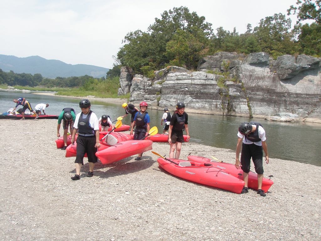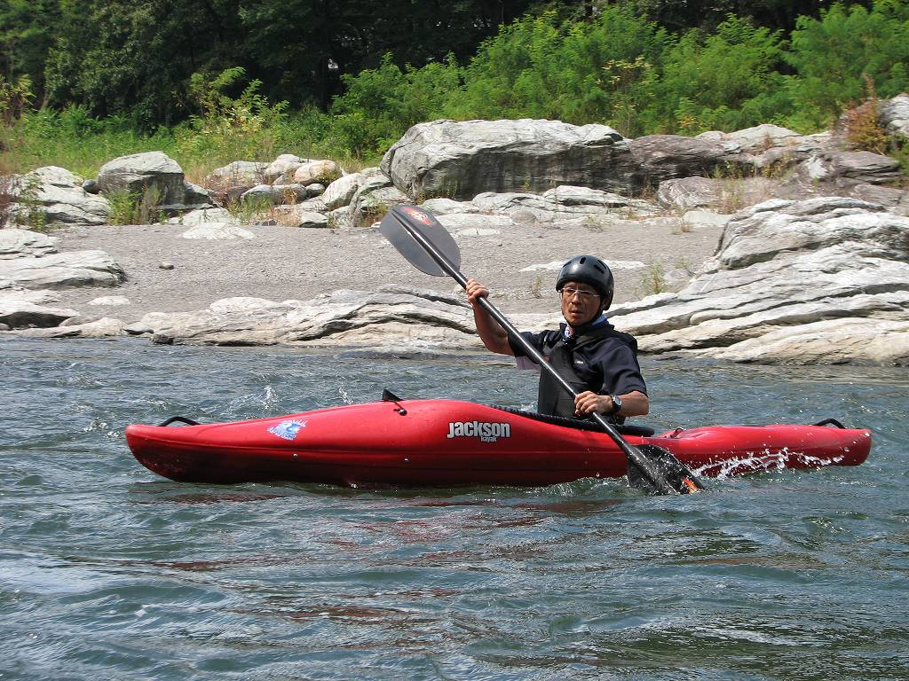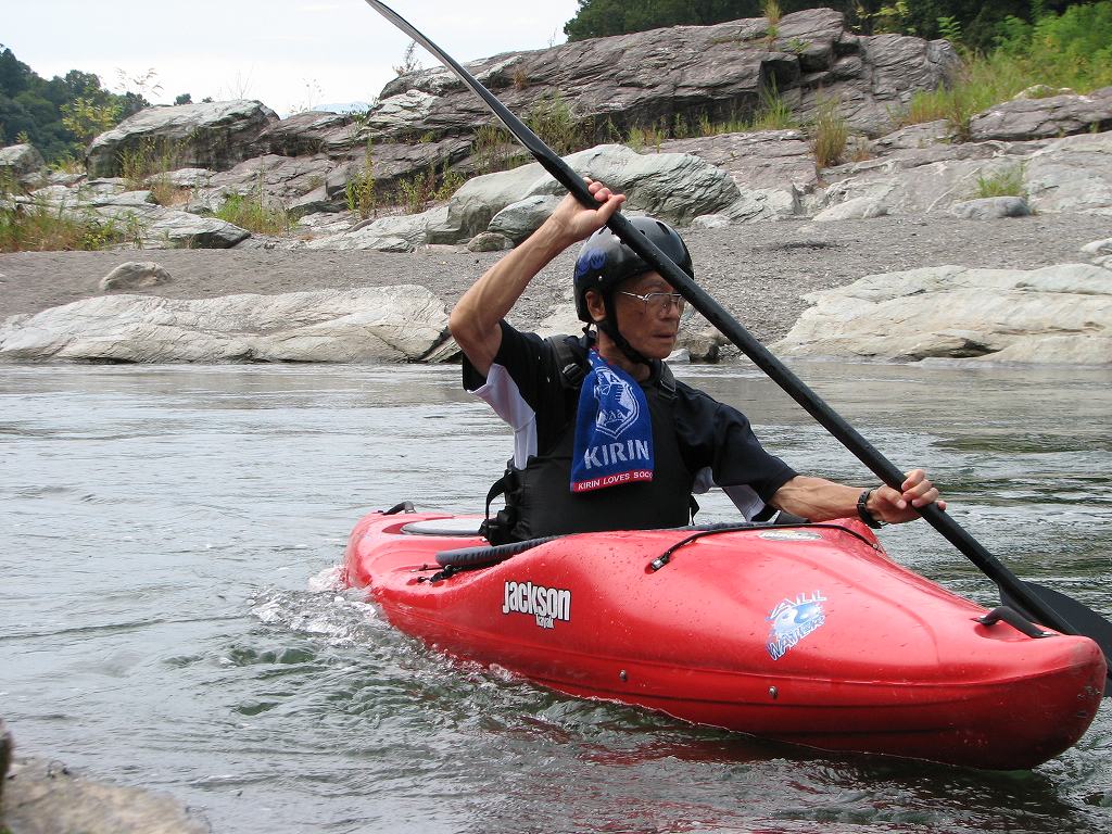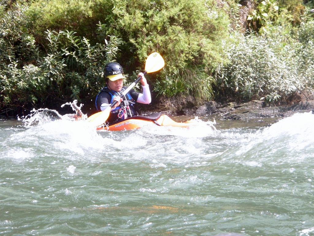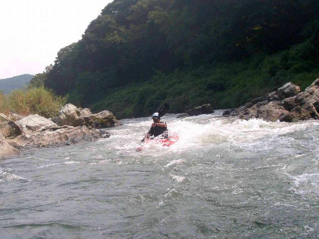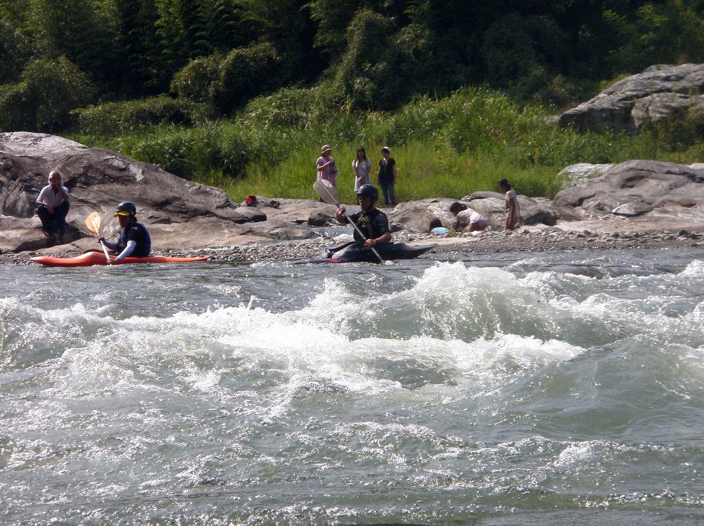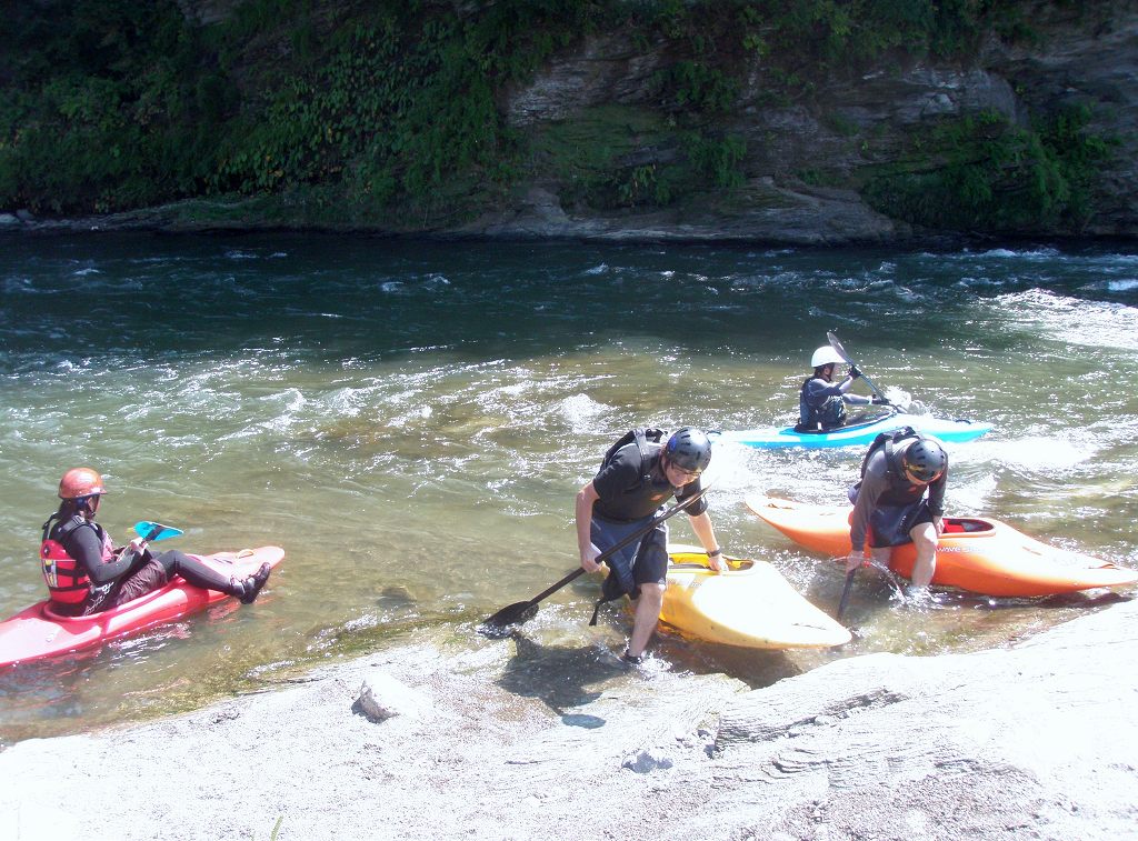 × [PR]上記の広告は3ヶ月以上新規記事投稿のないブログに表示されています。新しい記事を書く事で広告が消えます。 9月にはいってもまだまだあっつい日が続いてます。 今日も猛暑ですねぇ(笑 川の上はいくらか涼しくなってきたけど、それでも2時頃になるともうダメって感じです。 ベーシック2はフェリーと流れの中であわてないようにリラックスするための練習を繰り返し行いました。 ベーシック3では小滝の瀬が今日のメイン! ライン取りを考えてもらうために、コースを下見して、それから下ってもらいます。 もちろんただ下るだけじゃなくって、エディーをとりながら、点と点を模すんでのコース取りを考えてもらいます。川下りをする上でとっても重要な練習です。 朝夕が、すこーし過ごし易く感じてきたものの・・・