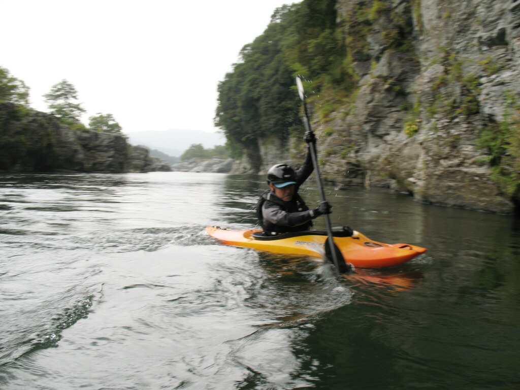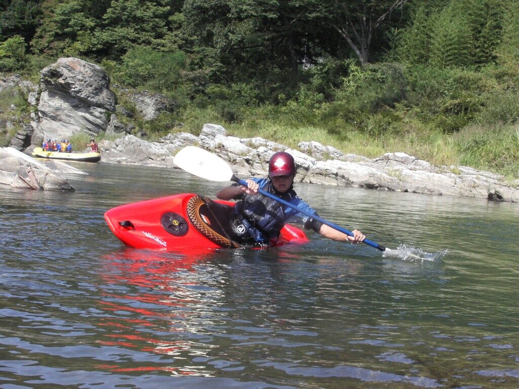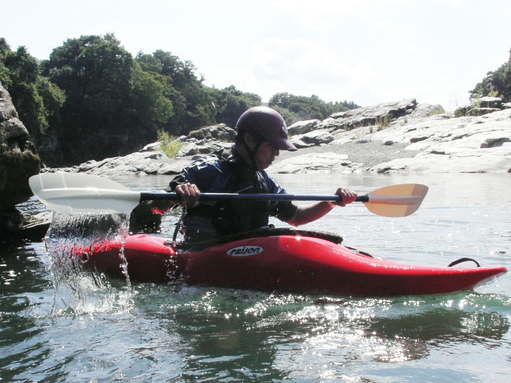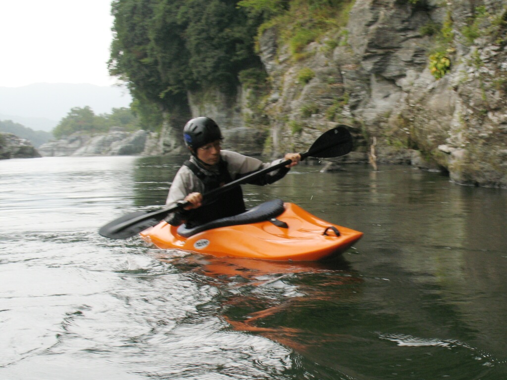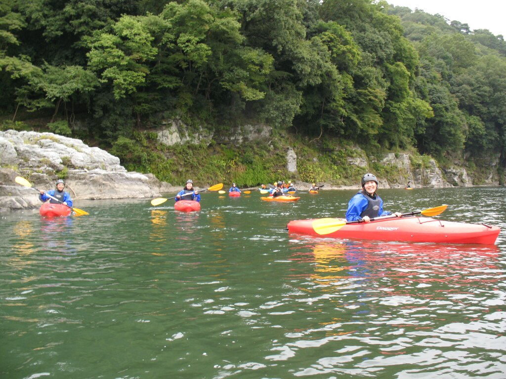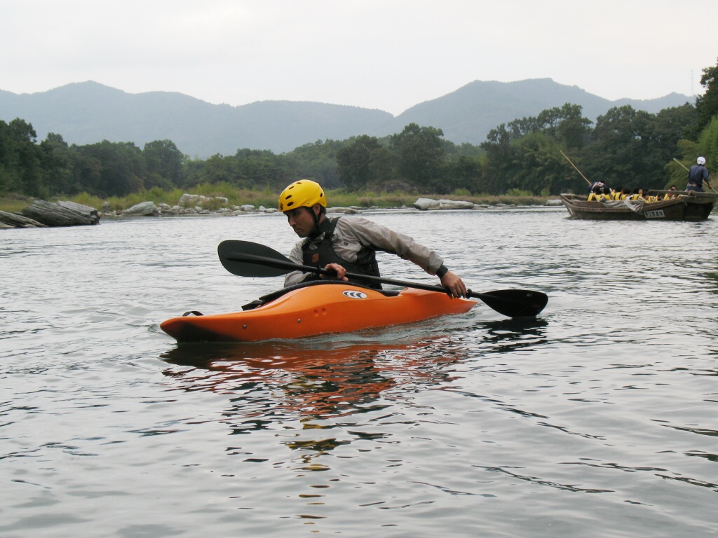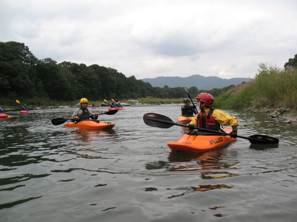 結局この日は体験カヤックとスクールを同時にこなすことになりました(悲ー 前日とうって変わって、悲しい曇り空 今日は体験コース5名とスクール4名 長瀞もこの日は大混雑! ライン下りの順番待ちは4時近くまで行列が出来てました。 もちろん川の上も大混雑(笑 青いウェアはラフトカヤックパックのお客さん。 グレイのウェアはスクールのお客さん。 ウェアが変わります。 この日のスクールはベーシック1から2へ移行しながら行いました。 静水での基本ストロークから、エディーラインを使ってリーニングの切り替えとターンを重点的に行います。 流れに上手く乗らないと、スピードが稼げなくなります。そうすると次のターンに勢いがつかなくなっつちゃうので気をつけましょうねぇ パドルの動きに気を取られると、今度はリーニングを忘れちゃったり(笑 いっぺんに色々やらなきゃならないので、難しいですよね! |