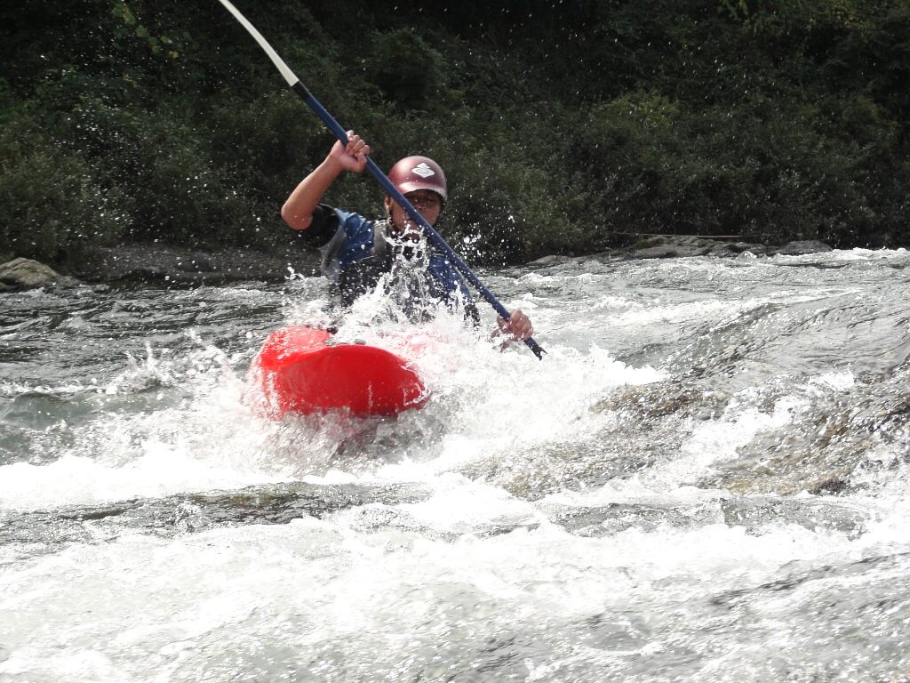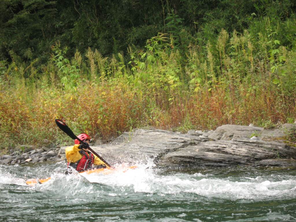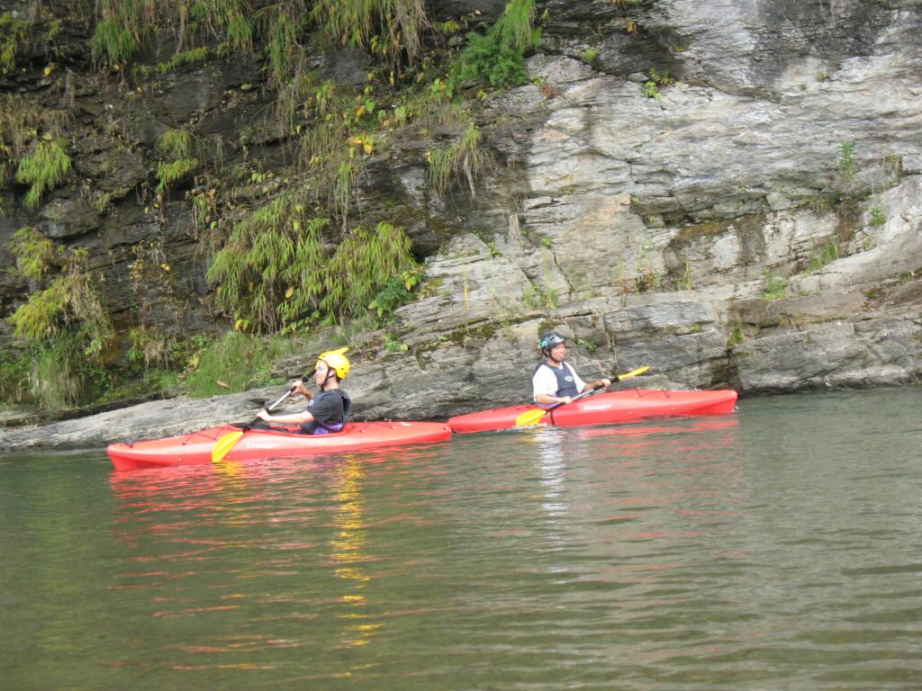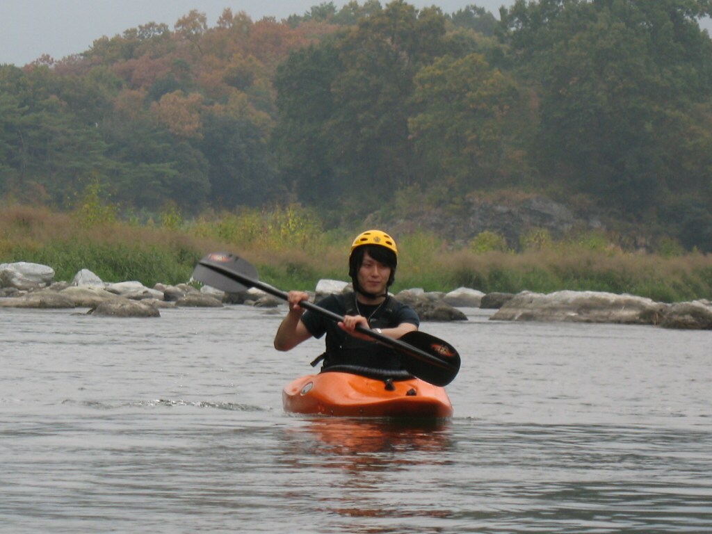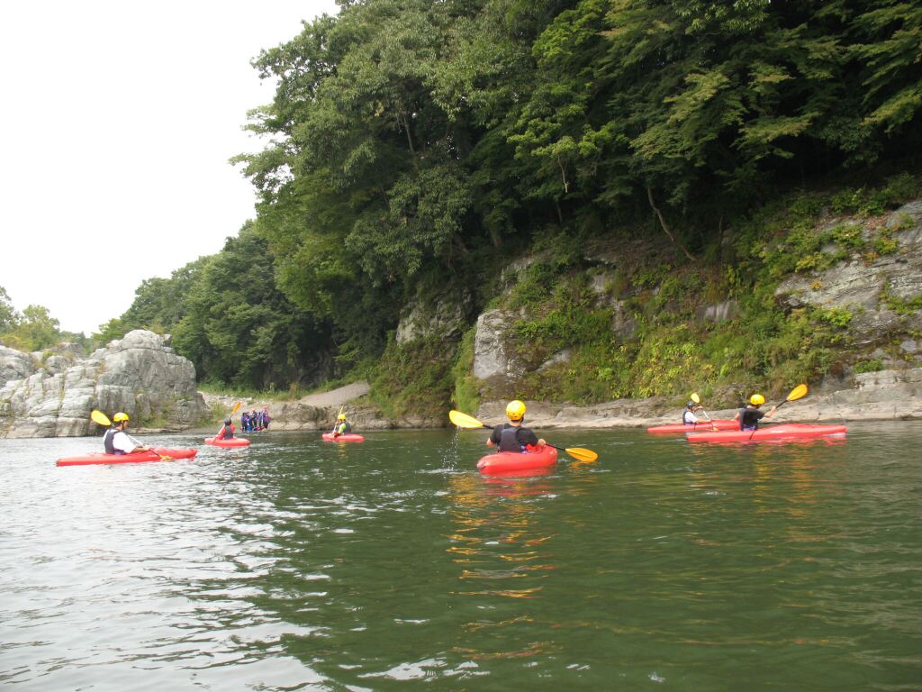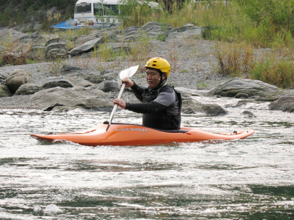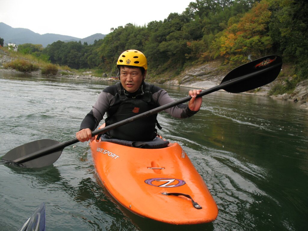 結局この日は体験カヤックとスクールを同時にこなすことになりました(悲ー 前日とうって変わって、悲しい曇り空 今日は体験コース5名とスクール4名 長瀞もこの日は大混雑! ライン下りの順番待ちは4時近くまで行列が出来てました。 もちろん川の上も大混雑(笑 青いウェアはラフトカヤックパックのお客さん。 グレイのウェアはスクールのお客さん。 ウェアが変わります。 この日のスクールはベーシック1から2へ移行しながら行いました。 静水での基本ストロークから、エディーラインを使ってリーニングの切り替えとターンを重点的に行います。 流れに上手く乗らないと、スピードが稼げなくなります。そうすると次のターンに勢いがつかなくなっつちゃうので気をつけましょうねぇ パドルの動きに気を取られると、今度はリーニングを忘れちゃったり(笑 いっぺんに色々やらなきゃならないので、難しいですよね! |