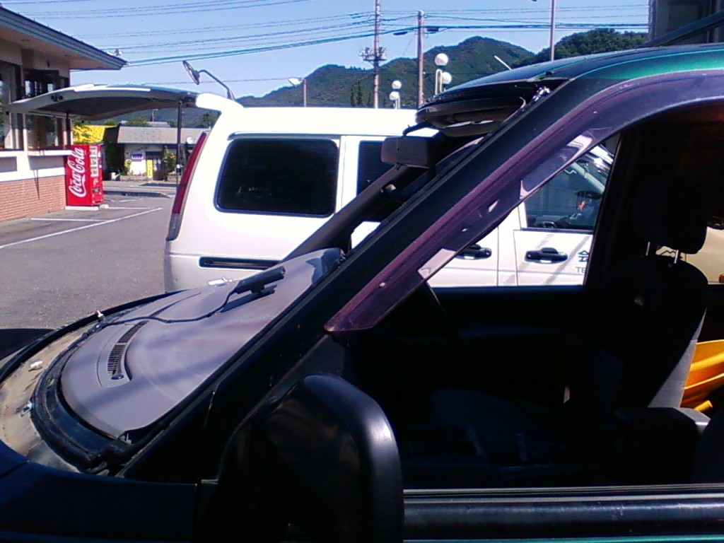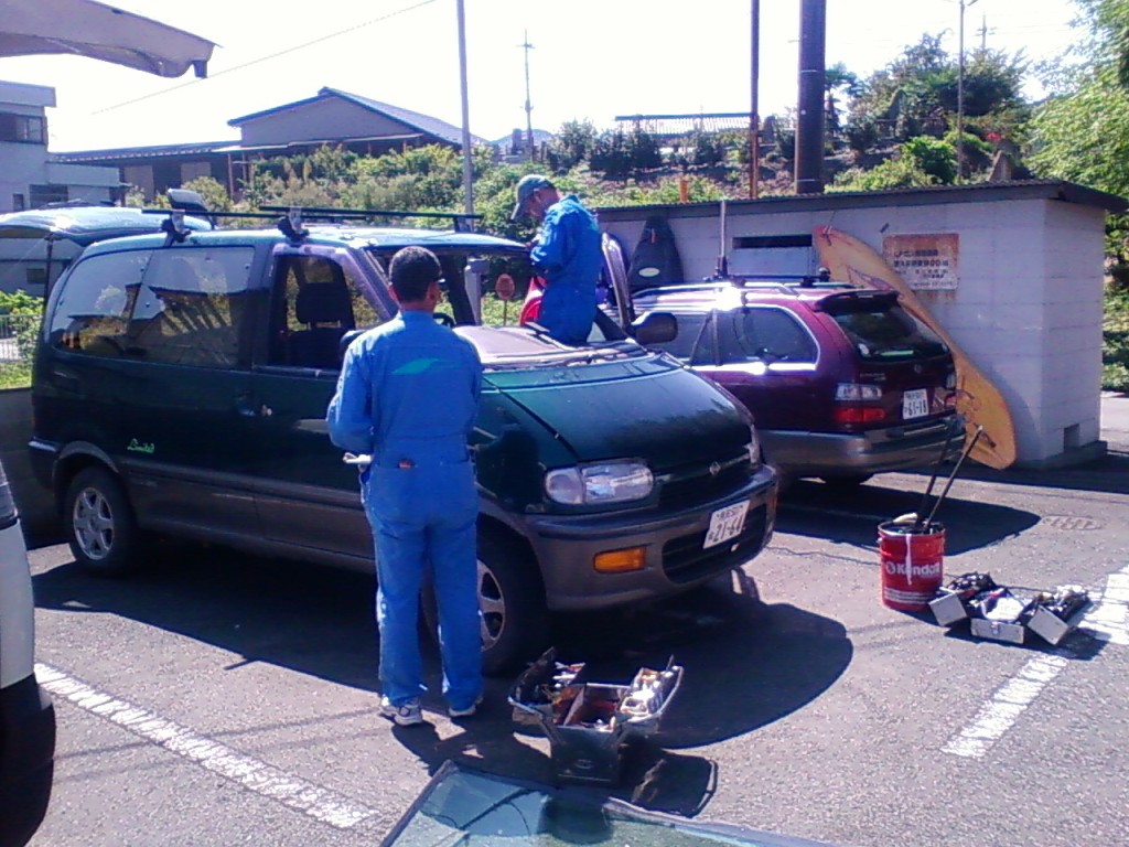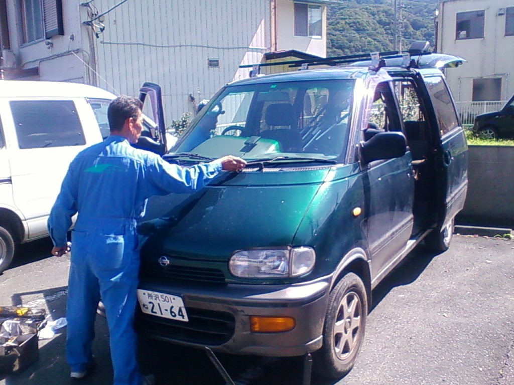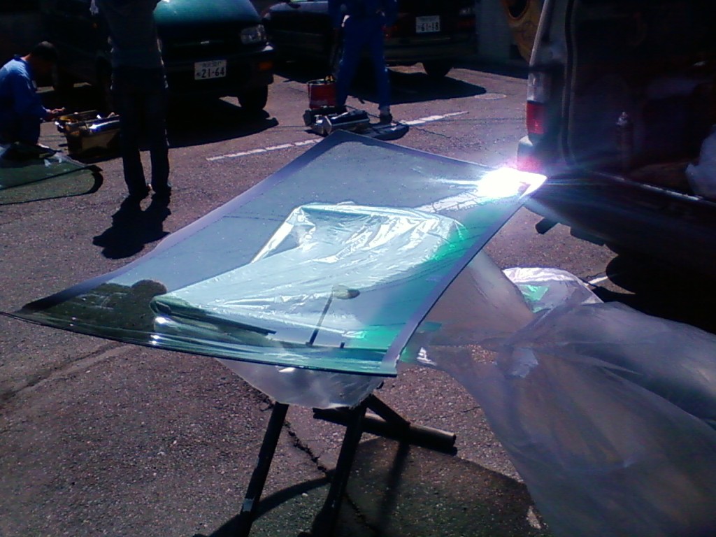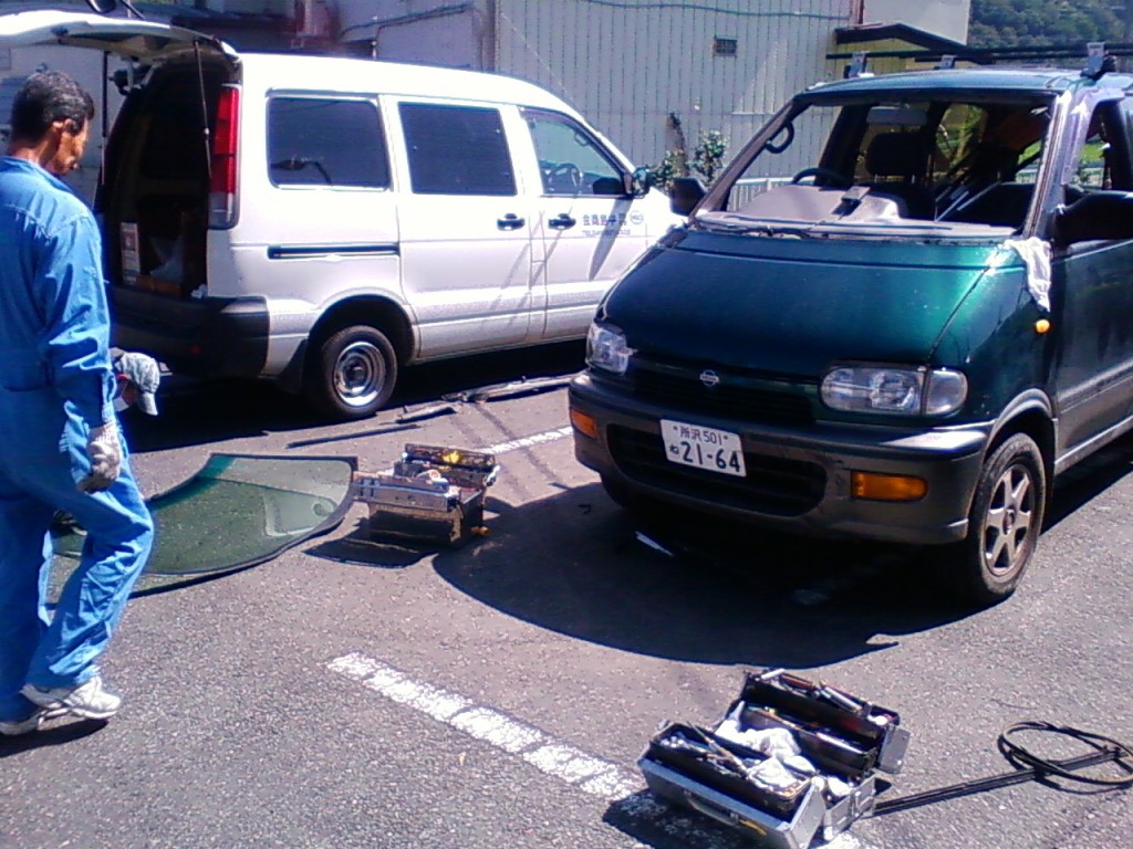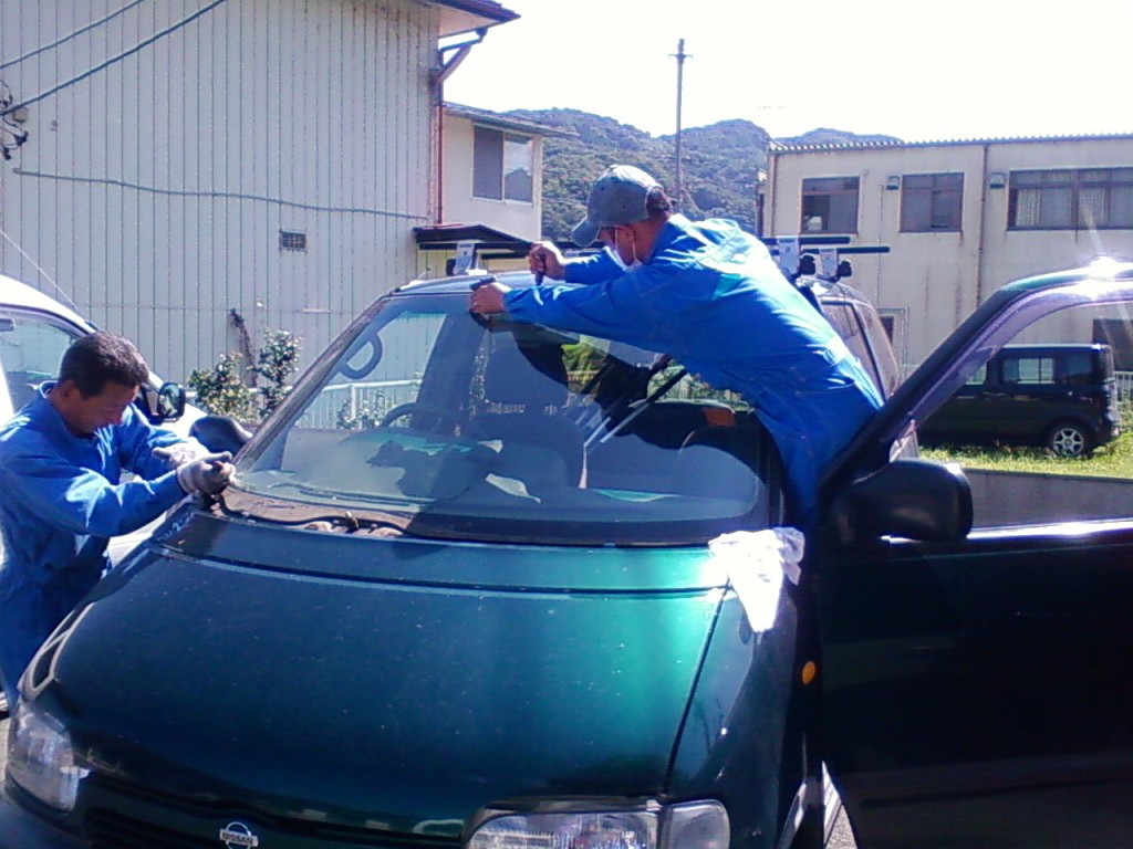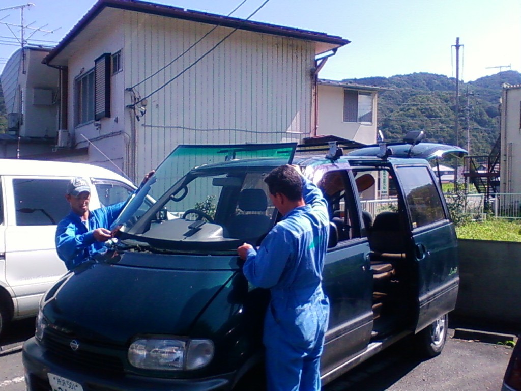 ネットで色々探してみたら、車のフロントガラスほど摩訶不思議なものもナイですねぇ。 純正だと10万は楽に越えちゃうのに、社外品だと半分の値段でOKって(汗 今回お世話になった中島商会さん 現地まで来てくれて、そこで修理してくれます。 出張修理で、お値段¥55800! 修理に出すとまた手間がかかっちゃうし・・・ 来ていただいて、ササーッと交換していただきました。 交換作業 ワイパーやフロントガラス周りのモールを取り外します。 で、専用工具で接着面をはがしていきます。 今回初めて知ったんだけど、フロントガラスって接着剤で張り付いてるだけだったんですね! てっきり4隅位はボルトで止まっているのかと思ってましたが(驚 フロントガラスが無いとちょっと妙な風景 バックミラーってこんなに飛び出してたんだぁ! フロントガラスのカーブってスゴイ! はがしたガラスの車検ステッカーをはがします。 新品のフロントガラス これに車検ステッカーを移します。 純正じゃないので、ボカシは入って無いと思ってたら、なんと入ってるじゃないですか! うれしー! お次は、車に接着剤を塗っていきます。 ガラスを接着! 溝にはめるとかそういう感じじゃ無くて、所定の位置に置く!って感じ(笑 はずしたパーツや新しいモールを組み付けて、作業完了! これで作業時間は1時間半かかってません。 自分でやったら、1日かかるかも(笑 PR