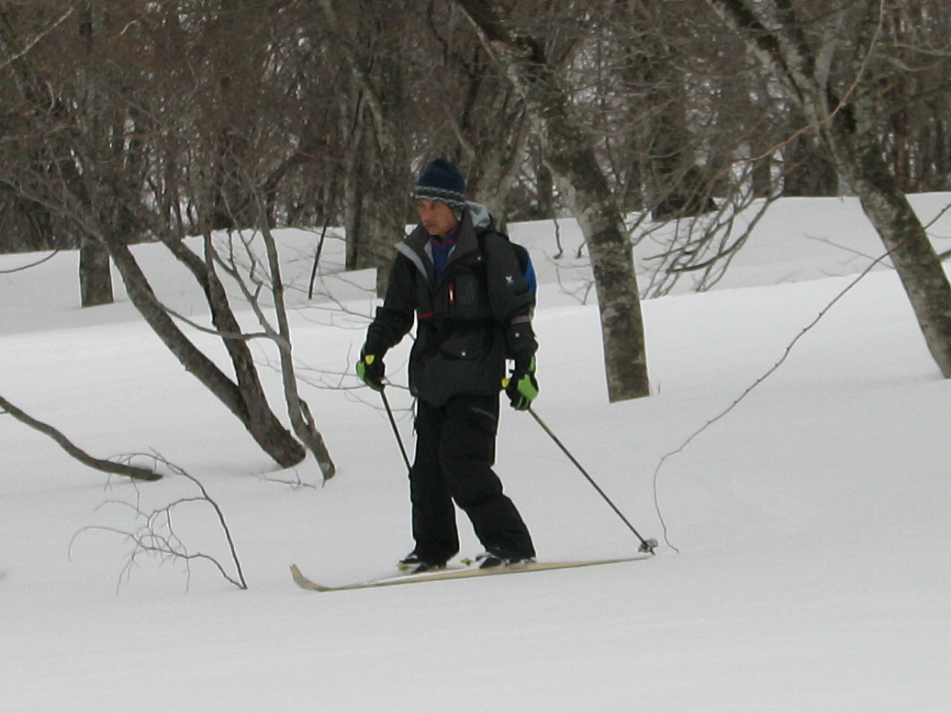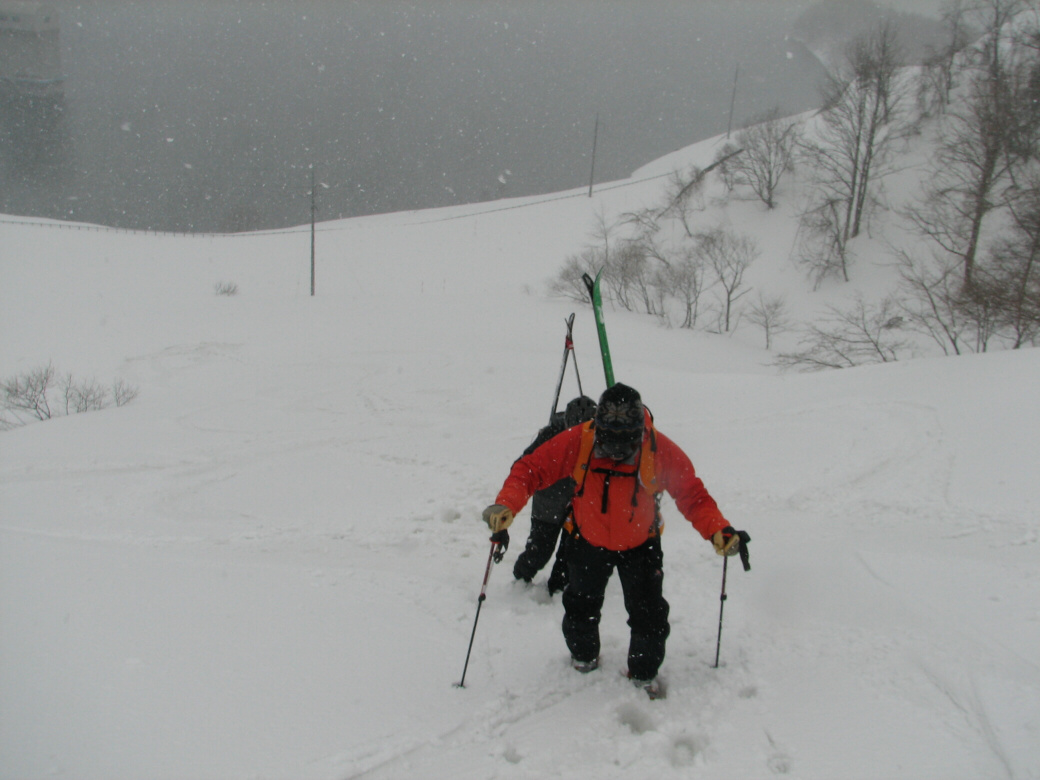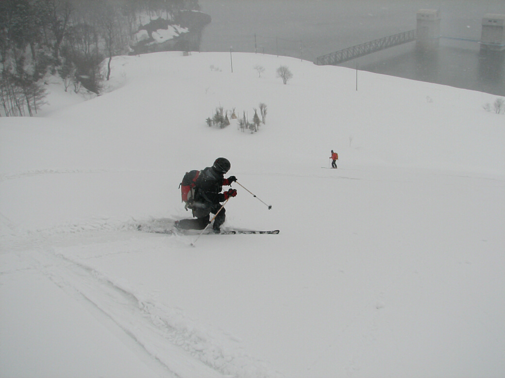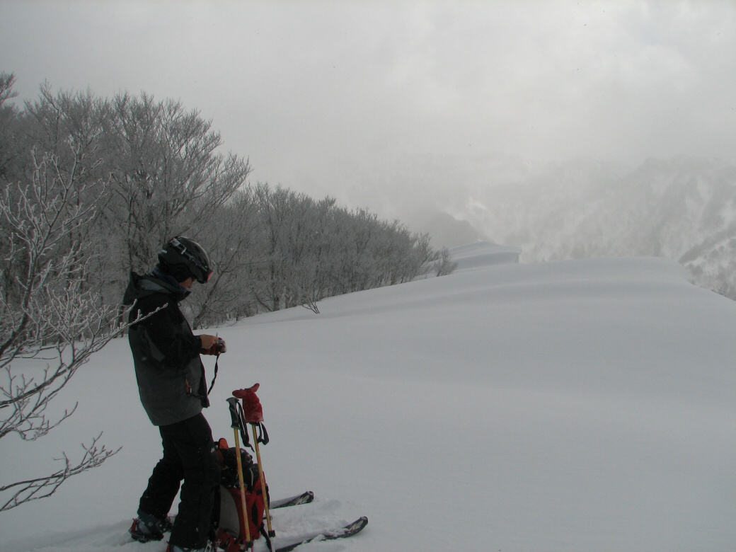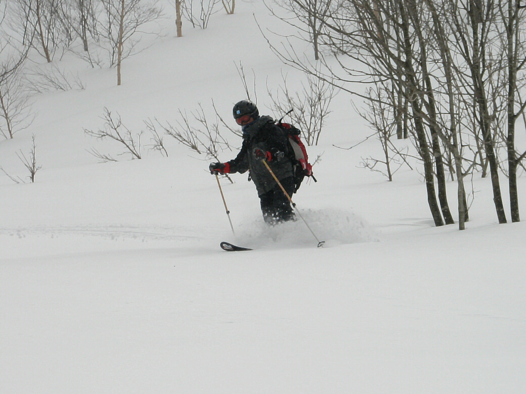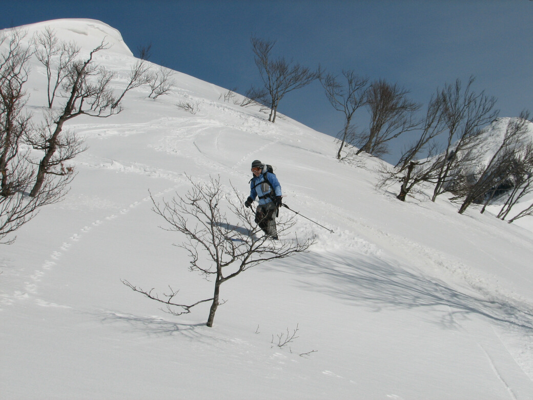 いや・・・そんなに荒れてるわけじゃないんだけど・・たまに青空も見えちゃったりします(笑 玉原のウッディーコースからファミリーコースに抜けるコース(ここだけ名前が無いんです) 講習するには最適なところ 何より人気が無くて(なぜかな?)他のスキーヤーがいません。 おまけに森の中にもヒョイって入れちゃうし(笑 リフト2本使わないと入れないんですね~ それが原因か? 今日のお客さんは、著名なプロスキーヤーと遊んでるツワモノです。 テレマークは、すごい勉強にになるって、楽しんでいただけました。 午後はミニツアーでBCにもちょっと出て見たり(笑 このコースは定番にしちゃおうかなーって考えちゃいました。 1日おいて、今日も夜後沢ですツアーです。 本来なら、戸隠に行くはずが・・・・お客さんも集まらず・・・結局夜後沢ツアーとなりました。 鹿俣山への最後のふんばりどころ!最後はツボ足で! 鹿俣山から稜線をつめて、いよいよ今日のピーク 1730Mの無名峰へ。 後ろに谷川連峰がクッキリ! 右から剣ヶ峰 獅子ヶ鼻 沖武噂 やっぱり今年は雪が少ないのかなぁ・・・ 剣ヶ峰もいつもはもっと白くなってるんですけどねぇ・・・ ゆ~っくりお昼を食べていよいよダウンヒル 今日は気温があまり上がらなかったので、南向きの斜面もいつもより滑りやすいです。 今日のコンディションは、凍った上に数センチの新雪が乗ってます。 メチャクチャ滑りやすい! ホントにゲレンデを滑ってるみたいでした。こんな事は、そうそうあるもんじゃないです。けれど山の中を滑る以上、トラブルは絶対!避けないといけないので、うかれて滑るわけには行きません。慎重に慎重に! 雪質が抜群によかったので、今日は後半いつもなら絶対に通らない沢も滑ってゲレンデまで帰って来れました。いつもなら最後はゲレンデを滑るのだけど、今日は最後までバックカントリーで終わることが出来たのもラッキーでした。 |