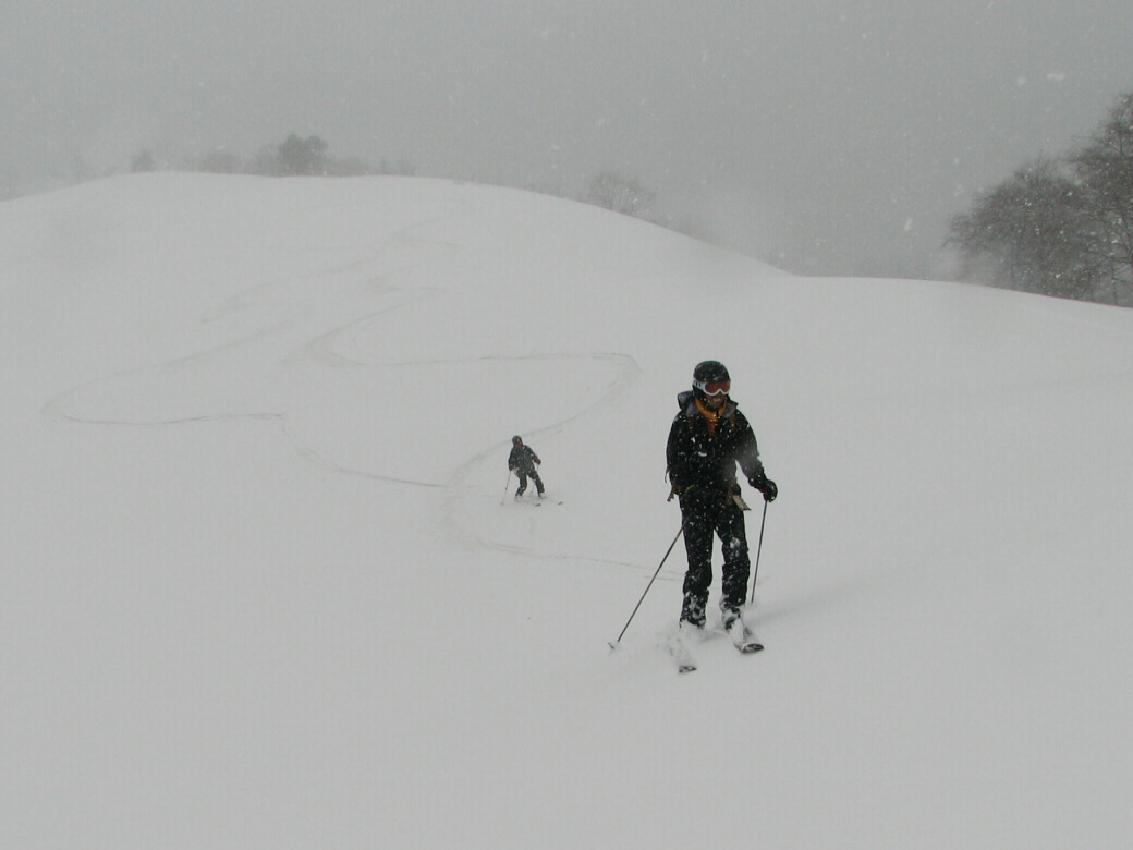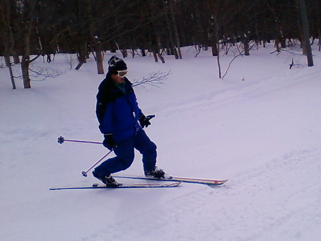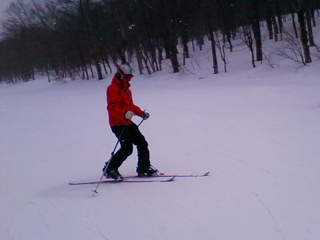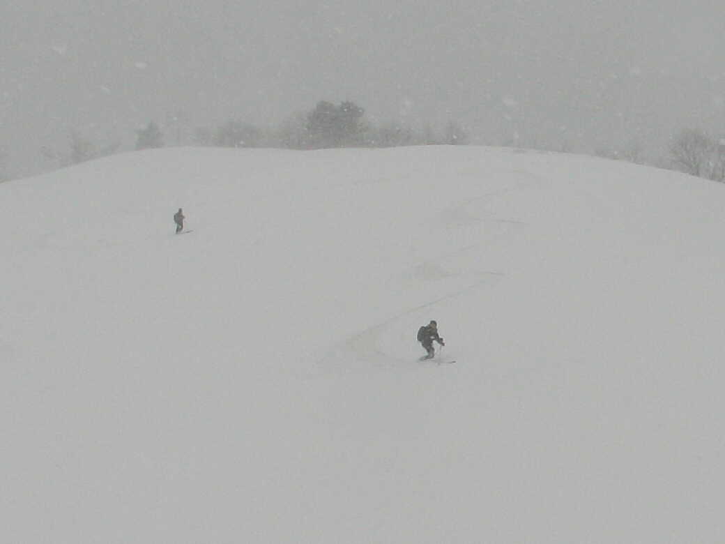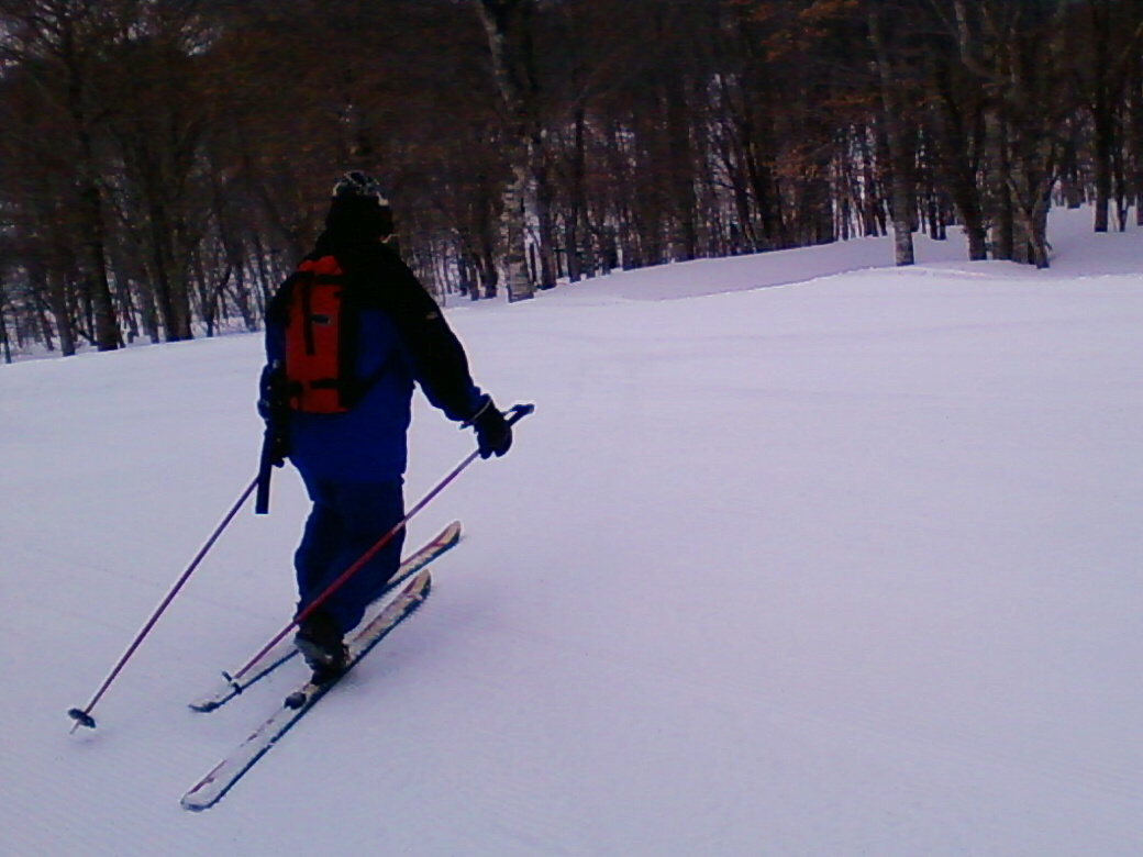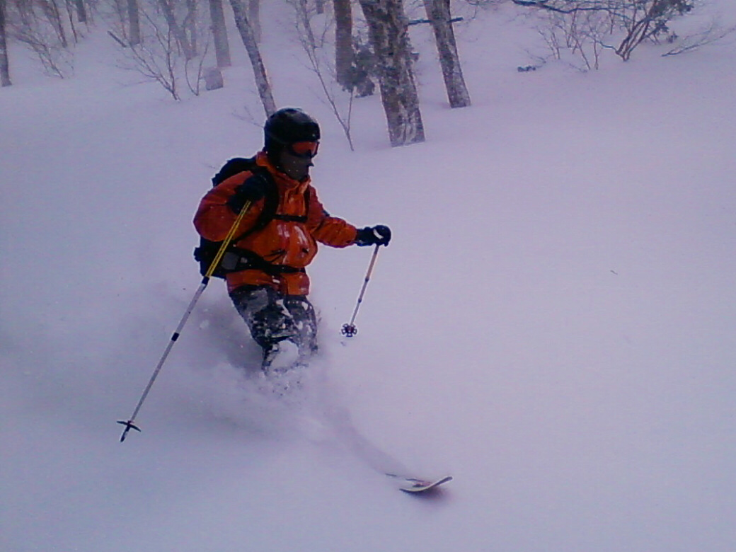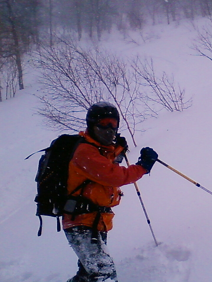 100%自然なスロープで滑ります。当然リフトも無し!自分の足で登ります。 ちょっと生憎な天気になってしまいましたが・・・ アバランチビーコンあれこれ 定期的にビーコンは使わないと、イザッてトキに使えません。 人工呼吸や心臓マッサージと一緒かなぁ? 人が死んじゃう!って時はどれくらい冷静さを残せるか?が大事です。 100%冷静ではいられませんから。 お昼を食べてると、雪になってきた! さっきまで晴れてたのにぃ・・・・ で!滑ります。 思いもかけず。新雪です。 新雪のすぐ下はグシャグシャの雪が! なんというか・・・・手ごわい雪ってやつですね! 登ります! 今日はツボ足です。 シールは・・・・メンドクサイです。 そしてまた滑る。 合計3本滑って、ゲレンデにスタスタ歩いて終了です。 写真には無いんですけど・・・・午前中はツリーで、アイスバーン!という本気モードのシチェーションもアリ!で、けっこう内容濃かったと思いますよ。