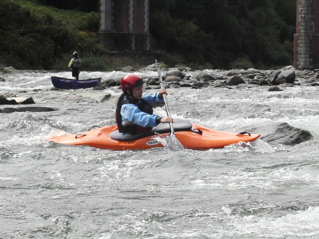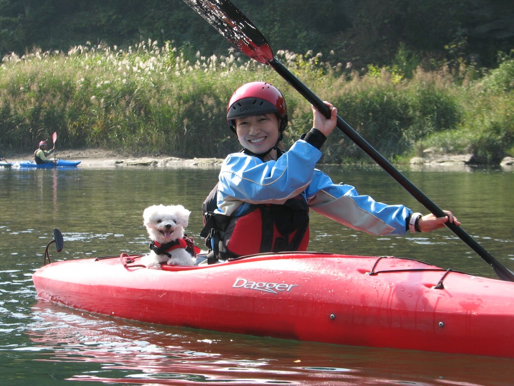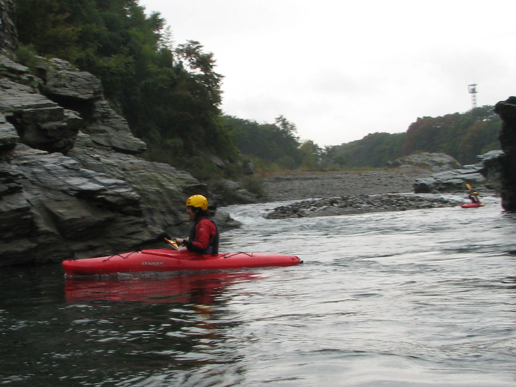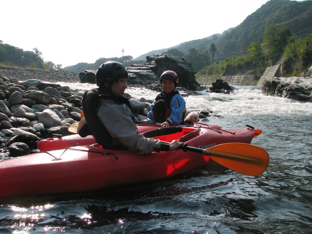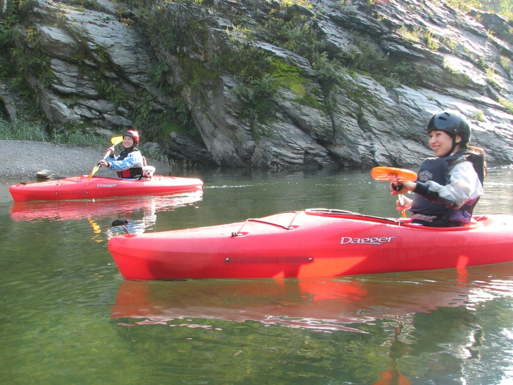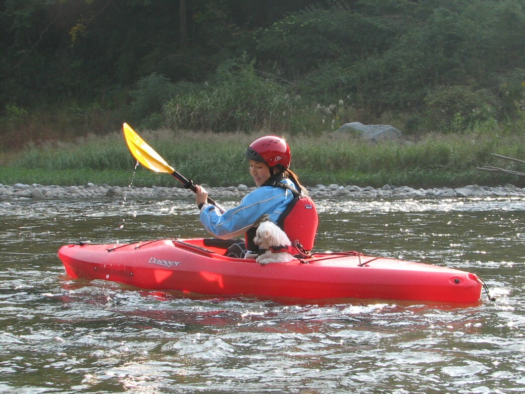 愛犬用のライフベスト買っちゃったので、ゼヒ下りたいって・・・気持ちはわかるので今回は特別ですよ(笑 どなたでも愛犬と一緒にお受けしてるわけではないので・・・ こちらはつれてこられた(笑お友達 なかなかどーして、いい漕ぎっぷりでした。 午前はと瀞場で基本を覆えてもらいます 午後からいよいよダウンリバー ちなみにここからですから・・・ 上流の激しいところは下ってません 今日も川の透明度が高いです。 のんびり下ります。 途中、ちょーっと流れの速いところもありますが、少しはスリルもないと寂しいですから(笑 紅葉が、ちょっと始まりかけてます。 シートの後ろにすっぽり収まって一緒に下りました。 カヌー犬誕生?