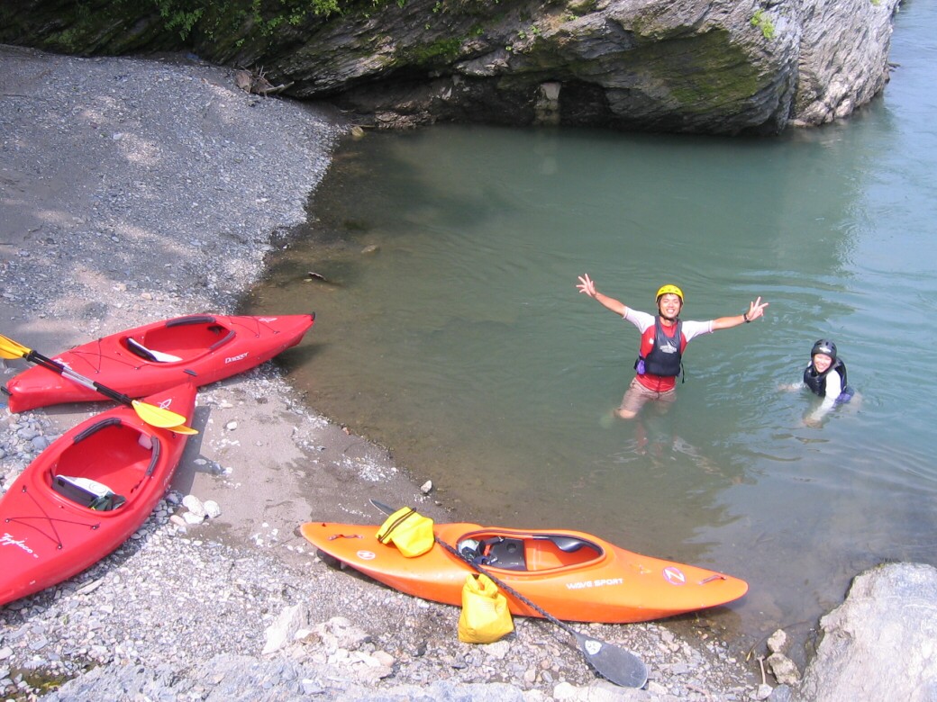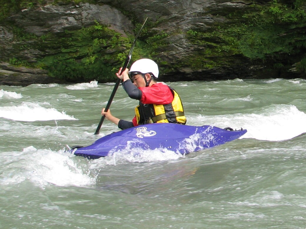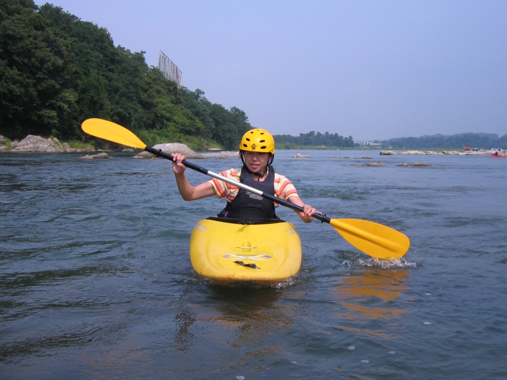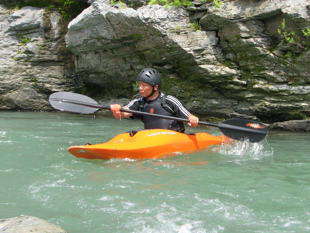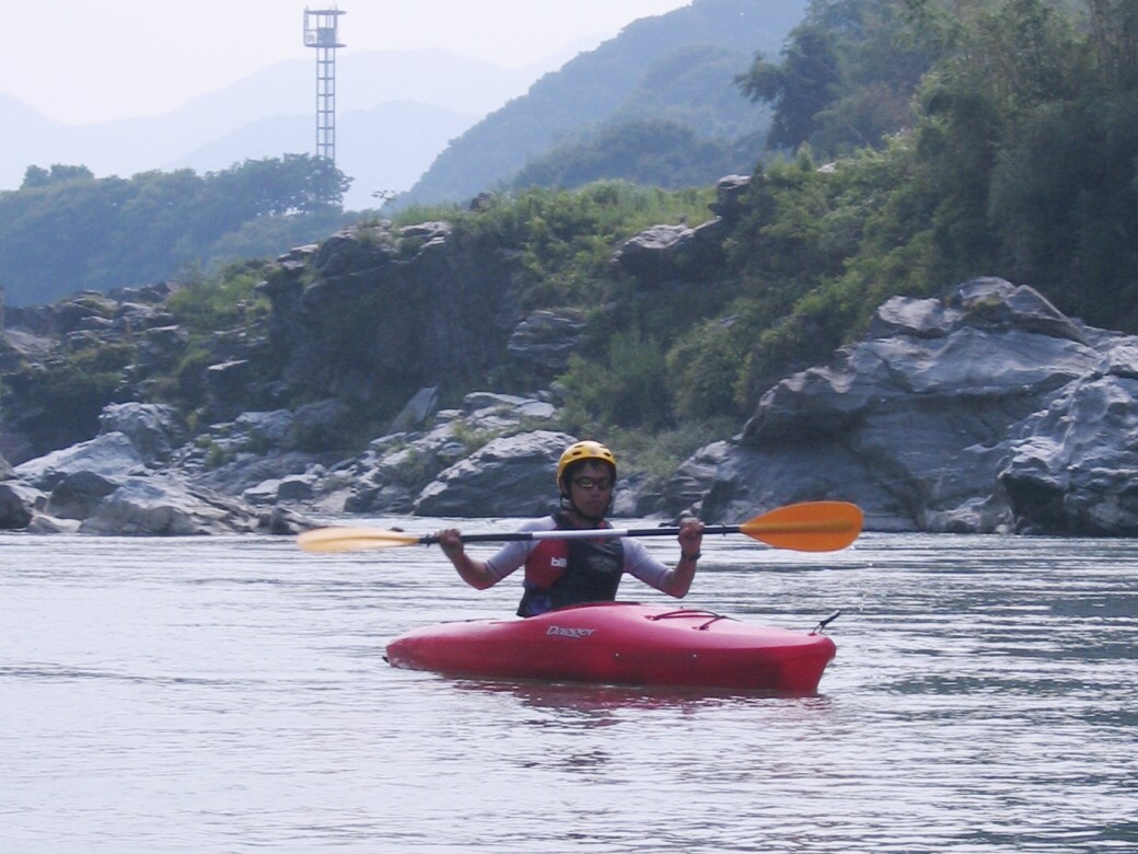 号令にあわせていっせいに水をすくっては投げ、すくっては投げって言うのを何度も繰り返しました。 川が増水して氾濫被害が出ないようにって言う、水神様へのお祈りだそうです。 最後にお神酒も頂いちゃいました。 今日のコースもベーシック3 昨日とは一転して、今日は速い流れの中でのコントロールを学びます。 自分で下るルートを考えて見ます。 見誤ると岩に乗り上げちゃうので、下りながら、スイープストロークでカヤックの向きを変えながら下る練習です。 長瀞の水量が最近ようやく?落ちてきて、講習するにはいいコンディションになってきました。 下るだけなら、多い方がいいんだけど、考えながら下ったり、繰り返し反復練習するなら、このぐらいがいいなぁ!