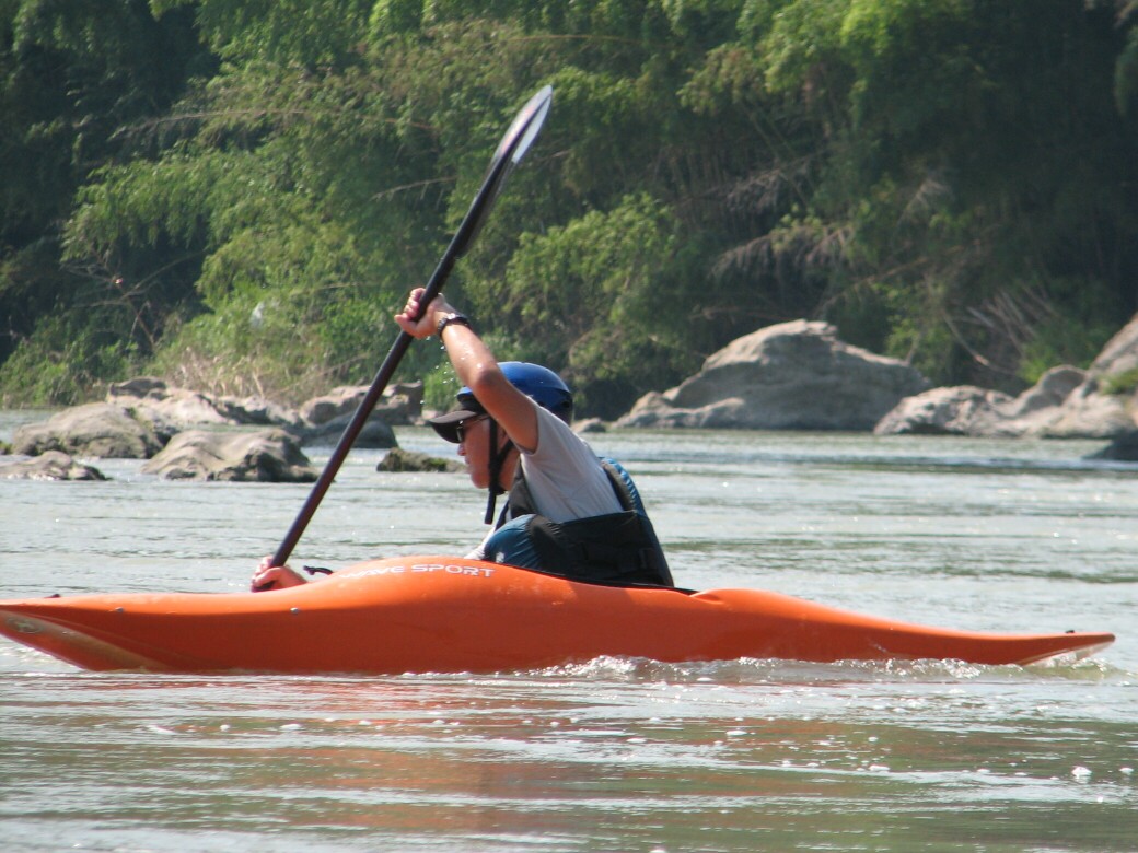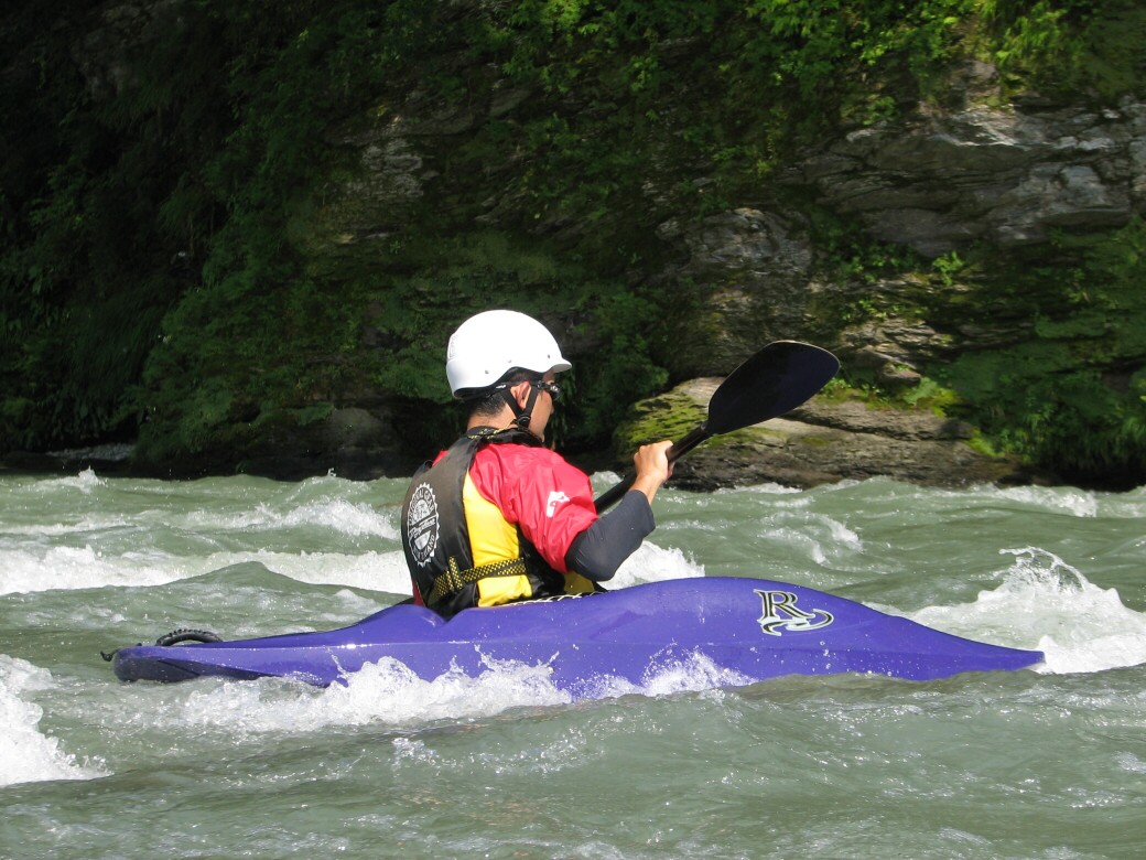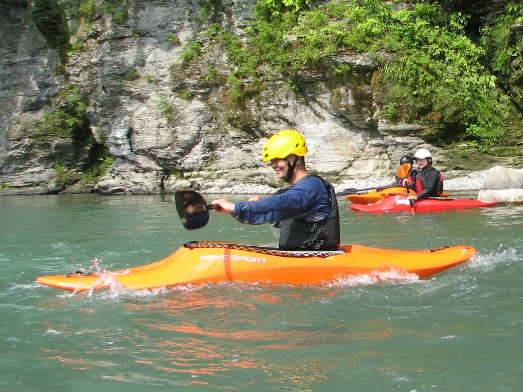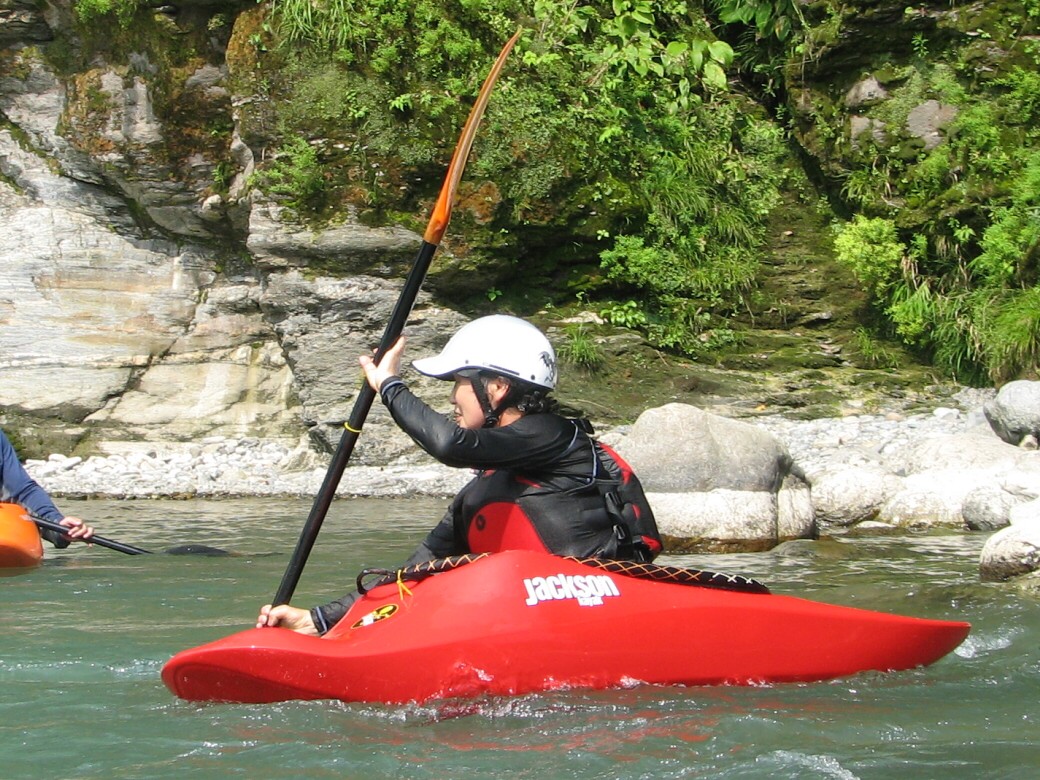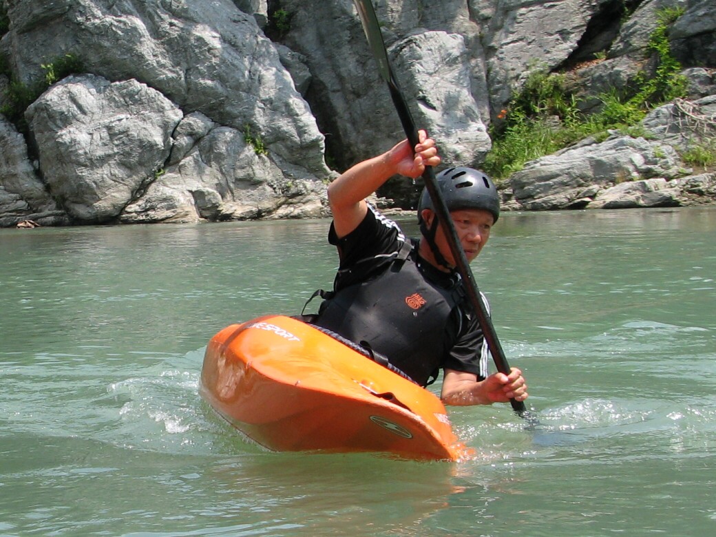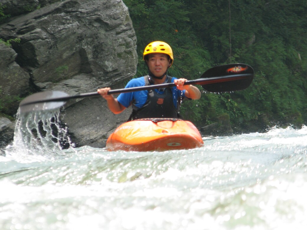 号令にあわせていっせいに水をすくっては投げ、すくっては投げって言うのを何度も繰り返しました。 川が増水して氾濫被害が出ないようにって言う、水神様へのお祈りだそうです。 最後にお神酒も頂いちゃいました。 今日のコースもベーシック3 昨日とは一転して、今日は速い流れの中でのコントロールを学びます。 自分で下るルートを考えて見ます。 見誤ると岩に乗り上げちゃうので、下りながら、スイープストロークでカヤックの向きを変えながら下る練習です。 長瀞の水量が最近ようやく?落ちてきて、講習するにはいいコンディションになってきました。 下るだけなら、多い方がいいんだけど、考えながら下ったり、繰り返し反復練習するなら、このぐらいがいいなぁ!