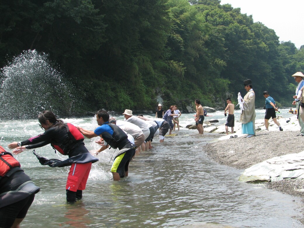 今日、長瀞での講習中、神主さんたちがやってきて、「ここで神事を行うので場所を空けてほしいんだけど」って言われて、へーって思い場所を空けて見学してたら、なにやら氏子さんたちが、一列になって川に入りだしたので、面白そうだなぁって思って神事に混ぜてもらっちゃいました。